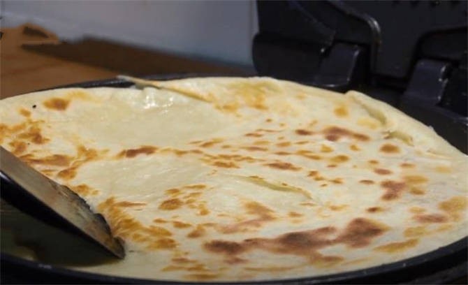 6.电饼铛预热刷油,放生胚,表面再刷一层油锁住水分,烙饼的时候火候不要开得太小,同时烙饼的时间也不要太长,不然烙的饼会又干又硬,中间勤翻面有助于出层,一直烙至两面金黄后就可以出锅了。