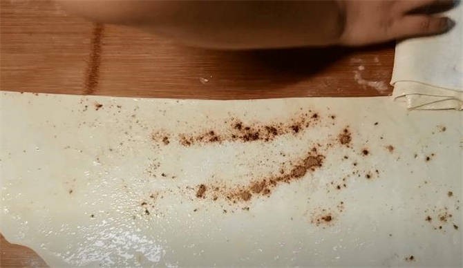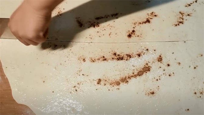 2.现在时间差不多了,案板上撒一些干面粉防粘,取出饧好的面团,不用揉以免起筋,直接整理成圆形,然后擀成一个一元硬币厚度的长方形大面片,表面涂抹一层食用油,撒适量食盐,五香粉调味。