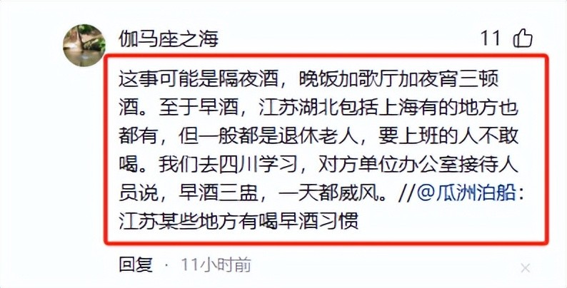 这事可能是隔夜酒,晚饭加歌厅加夜宵三顿酒。至于早酒,江苏湖北包括上海有的地方也都有,但一般都是退休老人,要上班的人不敢喝。我们去四川学习,对方单位办公室接待人员说,早酒三盅,一天都威风。