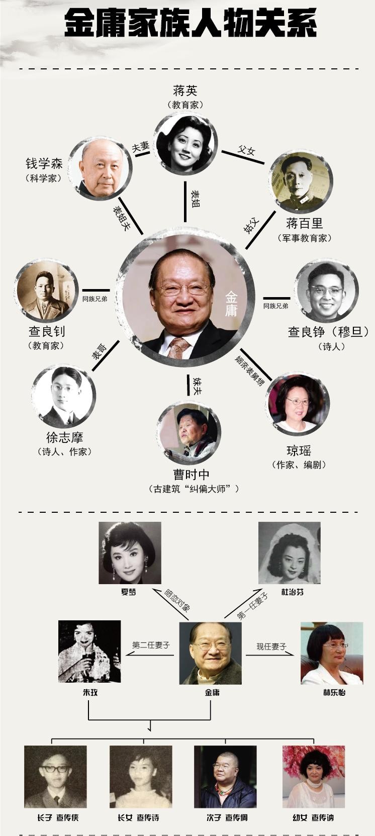 3、金庸先生绝对不会嫉妒徐志摩先生,不论从家庭还是个人来说;虽说查徐两家都是海宁的名门望族,但是徐家更多是商人,在徐志摩之前没有文人出现;而查家可不止是有钱,可谓俊采星驰、人杰地灵;查家至明朝起已经是真正的“文宦之家”了。清朝时期康熙亲笔题写了“澹远堂”的匾额赐予查家,并赐予一副楹联“唐宋以来巨族,江南有数人家”。即便是近代查家也是能人辈出;诗人查良铮(穆旦),教育家查良钊、查良鉴,“纺织大王”查济民,金庸的表姐蒋英——钱学森夫人,金庸的妹夫——曹时中,金庸的外甥女——琼瑶,这都是金庸家族文化的熏陶下,出现的各位大家。至于说金庸先生想去剑桥大学读书未果,其真实原因其实是战争的问题,金庸先生的才学不敢说一定胜过徐志摩先生,但绝对也不逊色于徐志摩先生。
