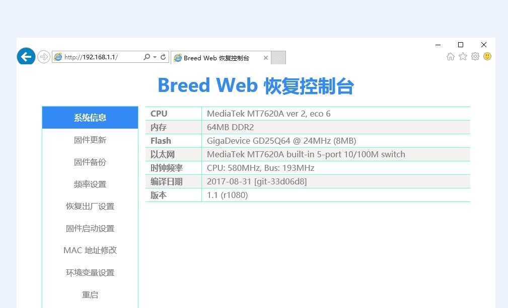 5、如果顺利,电脑浏览器访问 192.168.1.1 进入到「breed Web 控制台界面