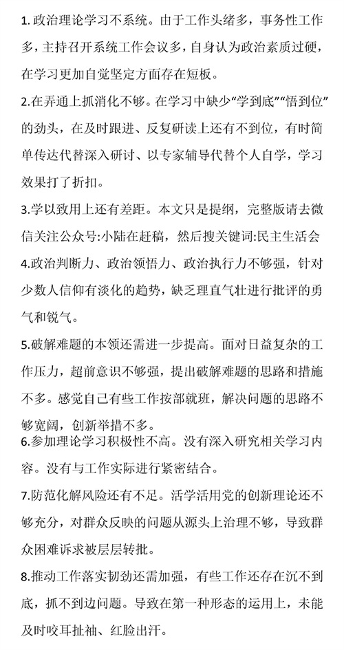 19.工作作风有待进一步加强。对发展中的新情况新问题缺乏深入分析。政治上的高度、定力、危机意识不强,思路、眼界不够宽。