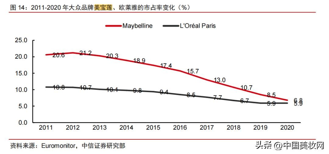 市场分析机构Euromonitor的数据显示,从2011年到2020年,美宝莲的市场占有率一度高达20%以上,但随着大众彩妆市场竞争不断加剧,日韩与中国本土彩妆品牌一波波出现,美宝莲在彩妆市场的统治力不断被削弱,占有率已下降至6.8%。
