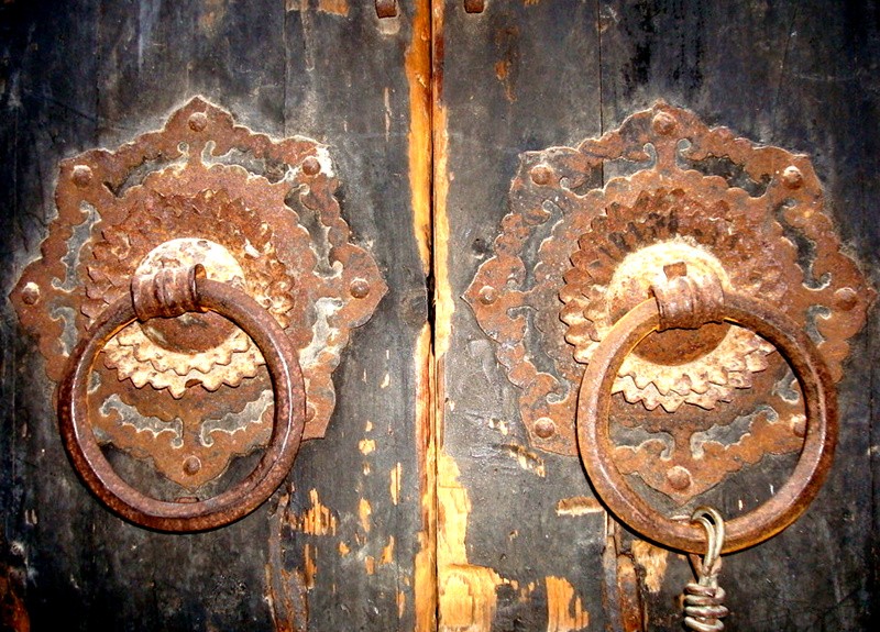 与门钉相比,铺首更常见。上至皇宫,下至普通人家,都会使用。权贵人家的铺首,一般都是兽头,造型有狮子、老虎、龟蛇猛兽等,口衔门环,起到辟邪镇宅的作用。一般老百姓家的铺首,则是一对儿直径约十几厘米的六角形铜片儿,倒扣在门上,中央有一圆形穹隆,顶部开一小孔,穿进一个卡子,一端穿过门扇起固定作用,另一端挂门环,也可是菱形、令箭形或树叶形的门坠。客人来访时,用手拍击门环或门坠,声音清亮,主人听到后便会开门迎客。
