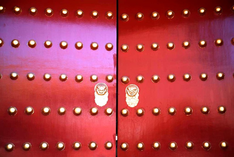 门钉这东西,最早是用来加固门板的,还有一定的装饰作用,清朝以前多为铁制,使用上也没什么限制。到了清朝,门钉数量和等级挂钩,具体来说,只有皇帝家,也就是紫禁城的宫门,才可以使用九行九列共八十一颗门钉,而且是铜制鎏金的;亲王府是纵九横七,郡王府是纵七横五,公爵府是纵横各七,侯爵、伯爵、子爵和男爵都是纵横各五,而且都是铁质的,不能用铜。您在遛弯时,如果看到一扇大门上带门钉,不妨数数看,房主身份也就猜个八九不离十了(有些新建的宅子用门钉充门面,不伦不类,不能算数)。