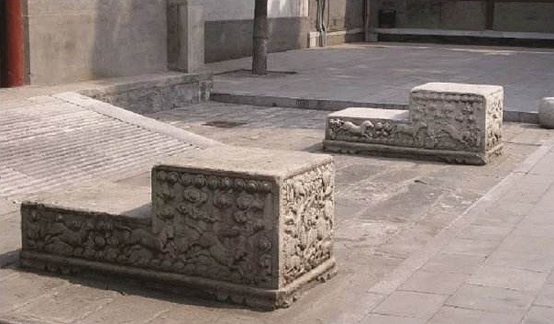 过去有钱有势的人家,出门经常骑马坐轿子,也常有贵客乘车马来访,到了门口,上下马车时,最好能有高点儿的东西垫脚,所以就会摆放一种叫上马石(也叫下马石)的石件,整体看上去就是一高一低两个台阶,由一整块石头制成,三面带吉祥图案的浮雕,也有表面光滑的。总之,有上马石的人家,非富即贵。