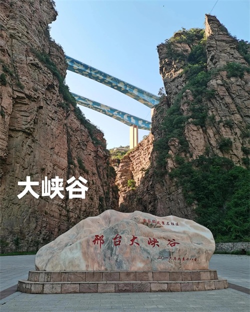 邢台大峡谷:又称峡谷群、太行奇峡谷群,位于邢台市西部,是中国最典型、分布面积最大的红砂岩峡谷群,是迄今为止国内发现的最大峡谷盆地群。邢台大峡谷有24条峡谷,150多座奇峰,80多个景点,8大水系,总占地面积160多平方公里。景区内山高水长、气候宜人、风景秀美,是著名的风景名胜区、旅游度假区、国家级地质公园。主要景观有:长嘴峡、流水峡、黄巢峡、竹会峡、飞龙峡、九眼泉、三龙泉、三股泉、三叠泉、五股泉、龙门潭、龙潭峡、卧峡、龙女峡、月秀峡、飞瀑峡、女娲洞等。
