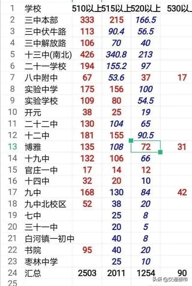 由于每个学校参加中考的人数不尽相同,所以在考虑人数的同时,还要算上比率。最好的要属13中上一中的比率大概是14.4%。实验中学897人中考,比率大概是13.2%。三中本部1601人比例大概为12.7%.二十一学校1043人大概是11%。二十八中(13中北校区)的比率10.5也很高。实验学校627人,的比率大概是10.1%。二十八中(13中北校区)10%。十二中大概10.7%,十七中为8.1%,二十二中7.4%。民办的博雅为7.3,也算可以。九中为5.12,十九中为5。可以说二十二中在走下坡路。