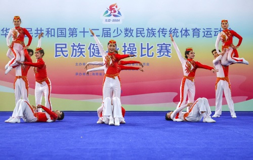 11月28日,新疆队在第二轮比赛中。当日,第十二届全国少数民族传统体育运动会民族健身操自选套路(徒手)比赛在西南大学三亚中学体育馆举行。新华社记者 杨植森 摄