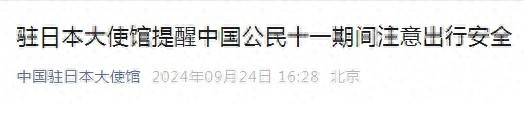 9月24日,中国驻日本大使馆发文《驻日本大使馆提醒中国公民十一期间注意出行安全》,全文如下:
