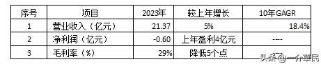 营业收入近10年持续增长,其中17年至21年为高速增长阶段,近3年在高位缓慢增长;净利润21年达到顶峰后开始下降,23年为亏损;毛利率近3年在高位波动。