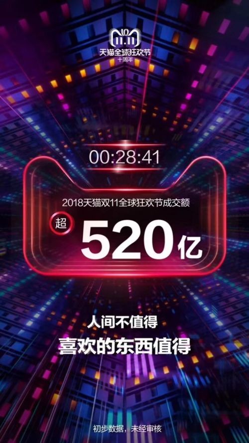 28分41秒,2018天猫双11全球狂欢节成交额超520亿元。