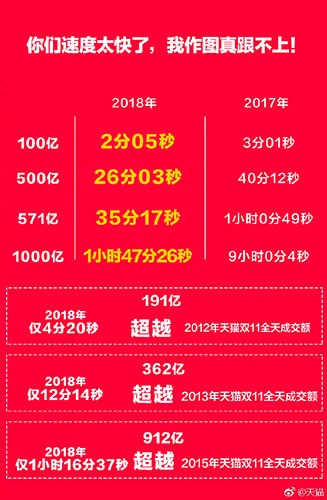 35分17秒,2018天猫双11全球狂欢节成交额超571亿元,已超过2014年双11全天成交总额!!2017天猫双11达到这一成绩,则用了1小时00分49秒。
