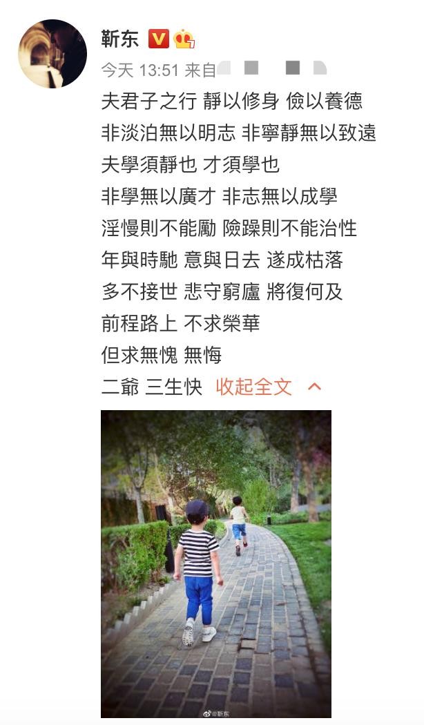 而相比之下,爸爸靳东的祝福就深奥了很多,中午,靳东也在社交平台上为儿子庆生,同样也分享出了两个儿子的合照。照片中的两位小朋友也是背对镜头,一起在向前跑。在文字祝福上,靳东引用了一段古文。