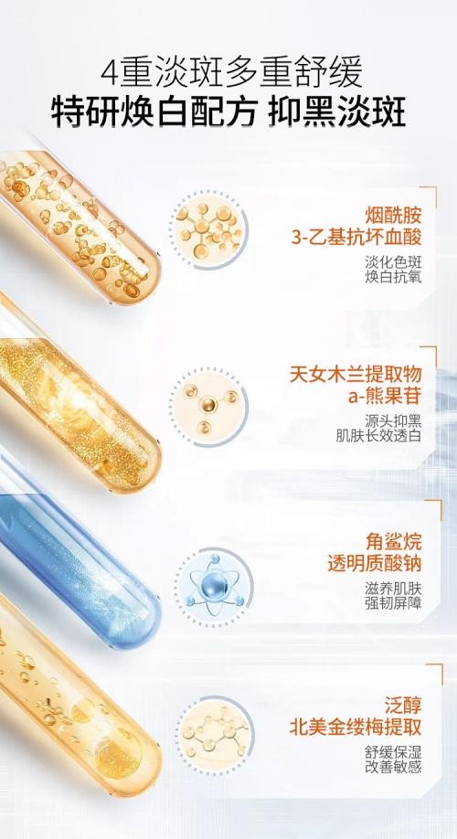 其里面包含的烟酰胺、天女木兰提取物、3-o-乙基抗坏血酸、α-熊果苷四重美白淡斑成分,主打的就是全链路美白淡斑,从分泌、分解、堆积的各个方面下手,堵塞黑色素从生成到沉积的这个过程,做到全方位拦截。这样下来淡化色斑的效率大大提升,肌肤也更白皙透亮。
