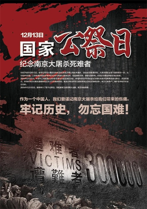 30万多名中国军民被残酷地杀害。这是多么令人震惊的反人类罪行和人类历史上最黑暗的一页。一群沾满中国人民鲜血的日本战犯受到了法律公正的审判和严厉惩罚,并始终被钉在历史耻辱柱上。日本军国主义的野蛮侵略给中国人民造成了前所未有的灾难。所有中华儿女为国家生存而战,民族复兴和人类正义而战。谱写了雄伟的历史诗歌,震惊世界和哭泣,取得了抗日战争的伟大胜利,彻底消除了现代抵抗外国侵略屡战失败的民族耻辱,重新确立了中国在世界上大国地位的新历程。纪念南京大屠杀和所有遭受日本侵略者袭击的死难同胞,以保护一个不可忘记的记忆并捍卫未知真相。