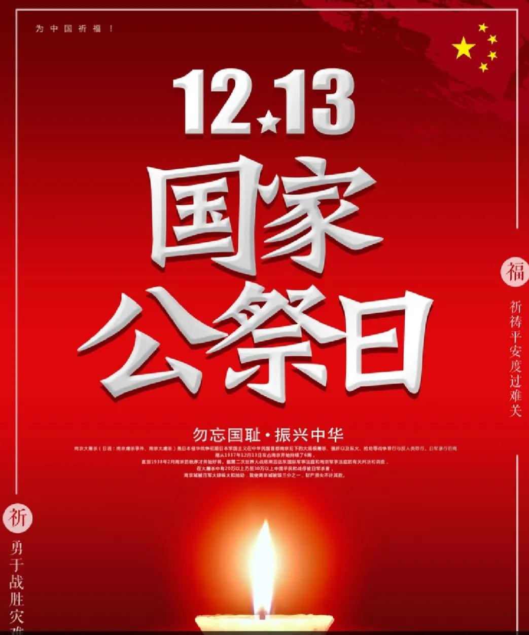 12月13日是南京大屠杀死难者国家纪念日。自国家纪念日成立以来,越来越多的人们在南京大屠杀遇难者名单墙上献花并默哀。缅怀遇难者的不幸,谴责侵略者残酷不是继续仇恨。相反,我们以历史为鉴和面向未来,共同珍惜和平与维护和平,使世界各国人民永远享受和平与安宁的愿望,希望祖国越发强大。让更多的人记住这段国耻,让此成为我们的动力,人人出一点力让祖国更加强大!