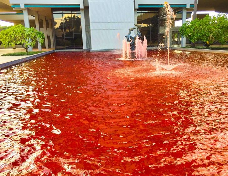 这红色的喷水池看起来像恐怖电影中的场景。
