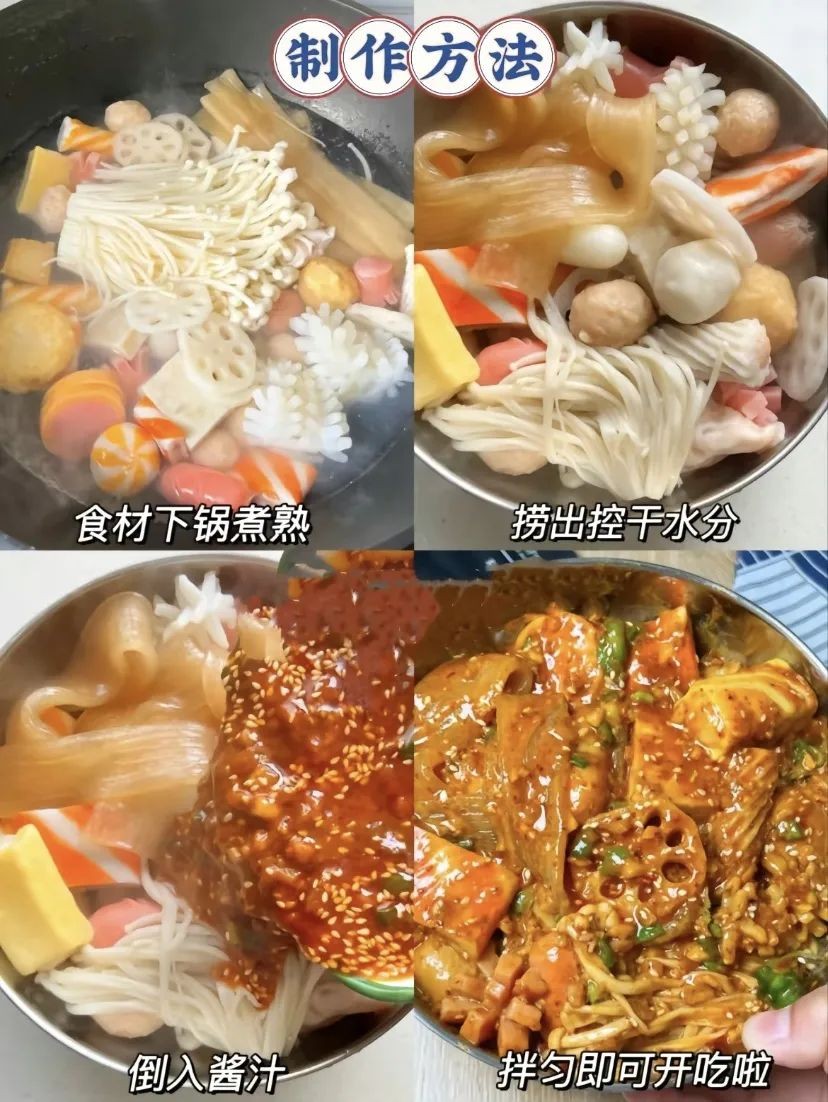 2 / 把喜欢吃的食材下锅煮熟,控干水分,倒入调好的酱汁,拌匀就可以开吃啦