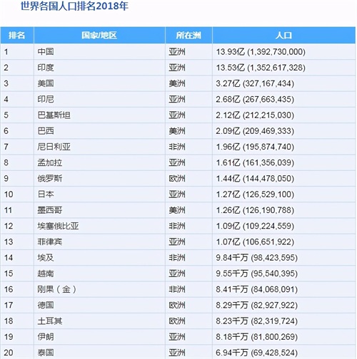 世界各国人口排名