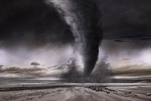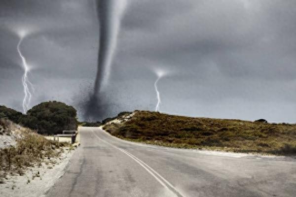 几分钟内,看似平静的天气就会转变为由旋转风暴主导的天空。乌云遮住太阳,使天空变黑。强烈的闪电,比太阳热五倍,发出响亮的雷声,然后,龙卷风就像一根手指伸到地面上落了下来。