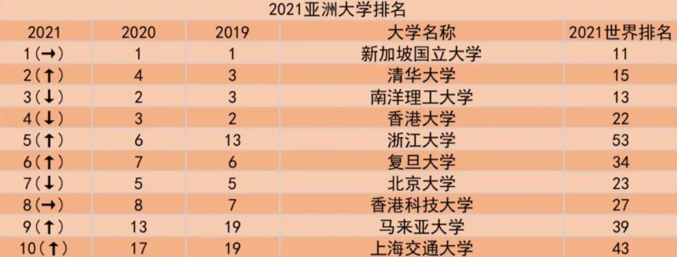 大家知道现在亚洲第一的大学是新加坡的国立大学,已经连续三年蝉联亚洲第一,第二的是清华大学。此外,靠前的还有香港科技大学,马来西亚大学等等。中国的清华大学排名第二。这已经是中国大学在亚洲排行榜上最靠前的一次。