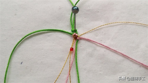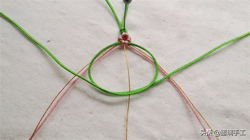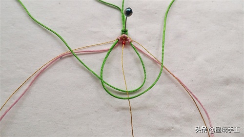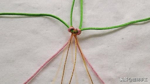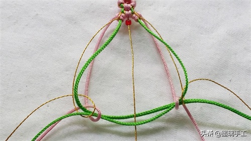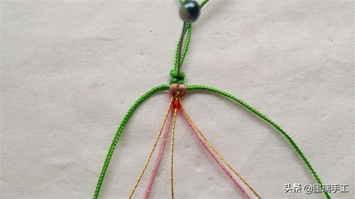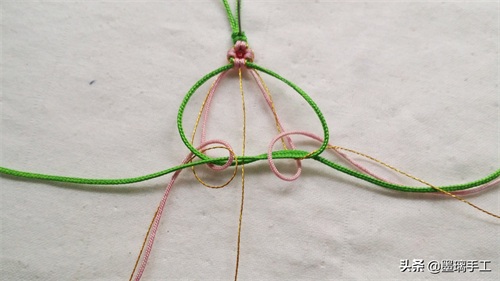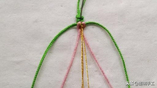 7.看右边。先用右边的绿色线做轴线,右边的金丝做绕线。编半个雀头结。粉色线也是编半个雀头结。如图: