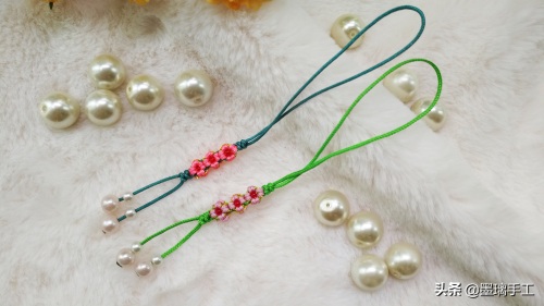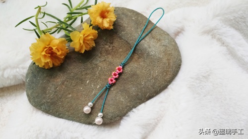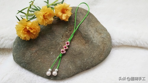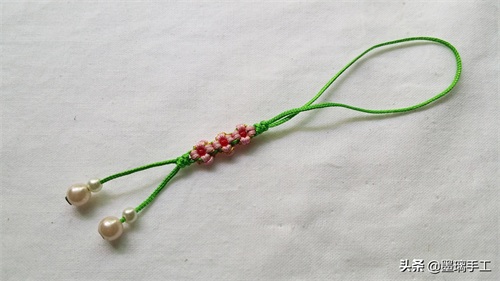 22.最后尾线串上珠子。剪去多余的线,烧粘好。整个桃花结手机挂饰就编织好了。如图:
