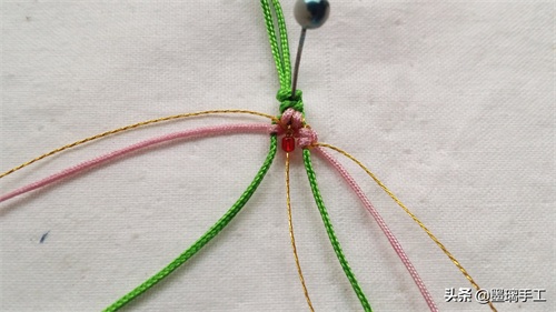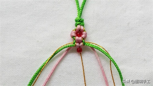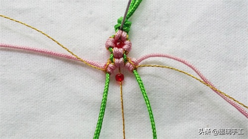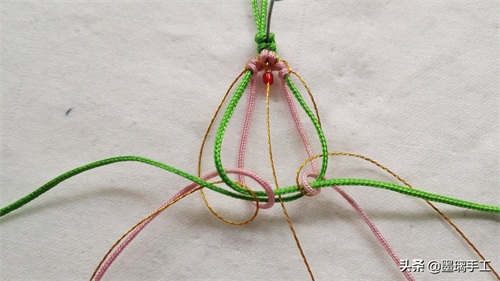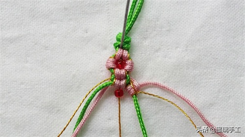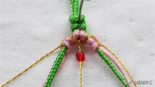 19.左边的金丝和粉色各编半个雀头结。右边也是金丝和粉色各编半个雀头结。拉紧绿色的线就是第2朵桃花 编好了。如图: