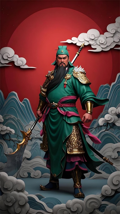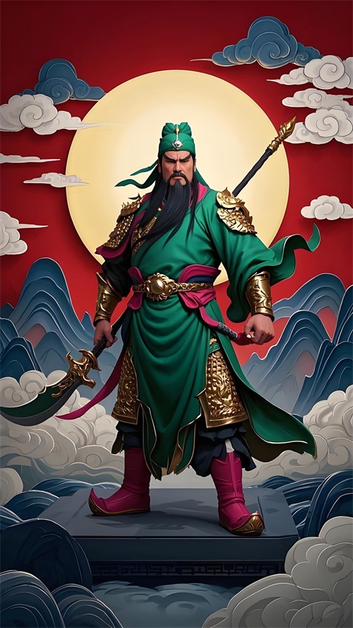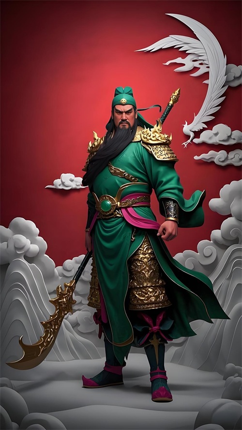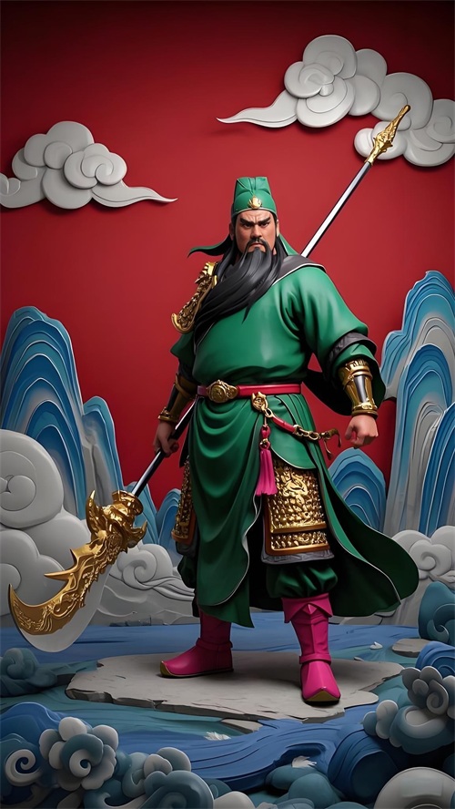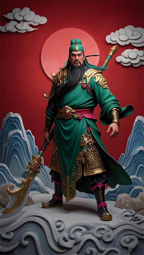 关公目光如炬,直视前方,眼神中满是不容侵犯的威严;左手悠然捋须,尽显沉稳儒雅,右手则有力地握持着青龙偃月刀,刀锋向下,好似能将世间一切邪祟罪恶斩于刀下。