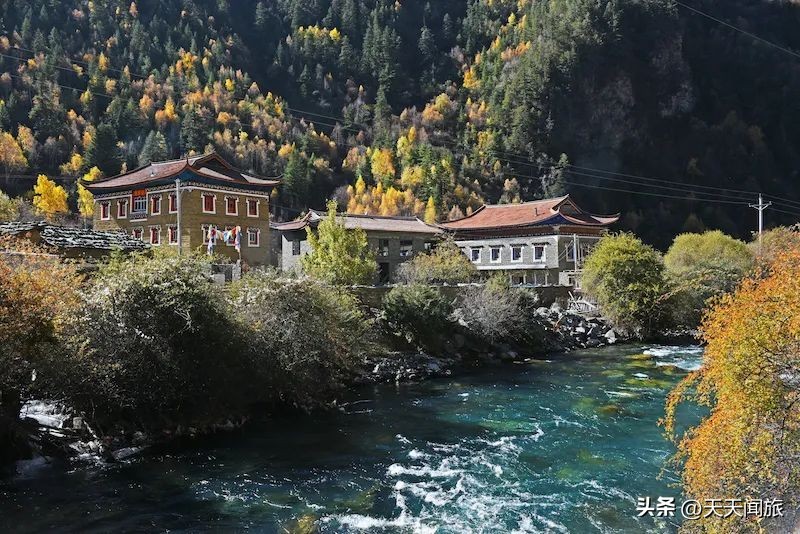距离新都桥镇2公里的十公里的风景长廊,是摄影爱好者心中的圣地。这里平坦的道路,蜿蜒的小河,夏季漫山遍野的野花,秋季金黄的杨树林,在秋阳中发出耀眼的金黄。
