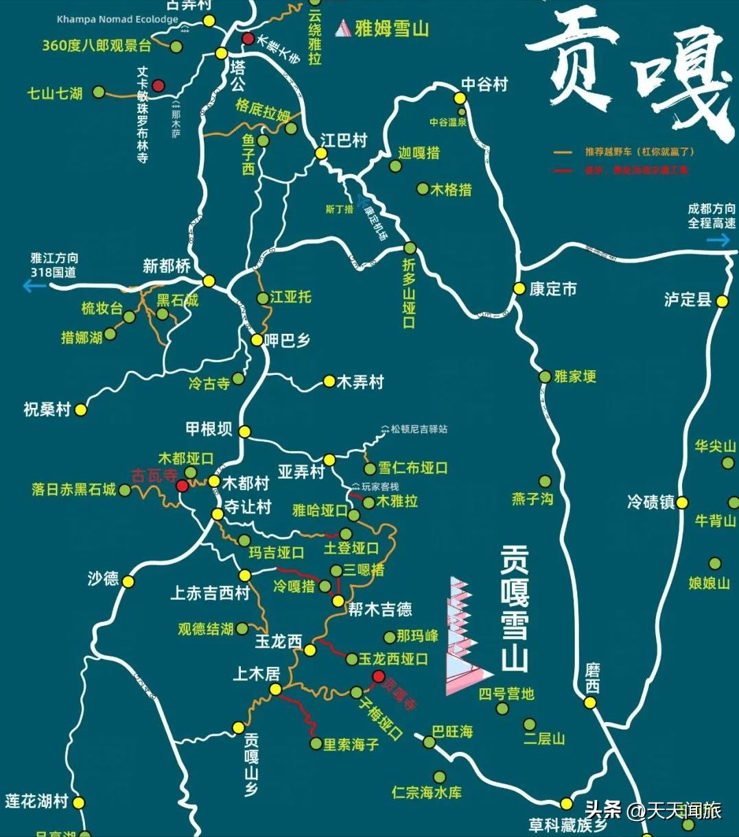 贡嘎雪山周边示意图,有许多圣湖、垭口、山巅可以观看贡嘎雪山