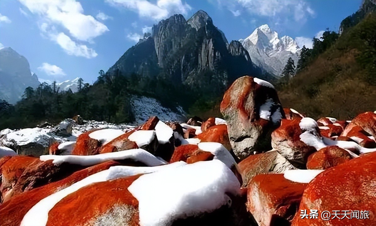 2)红岩顶,是360度天然观景平台,具有雄伟、险峻、神奇、清幽的原始风貌,与贡嘎隔着云海相望,还可眺望峨眉山、四姑娘山、二郎山等群峰环抱。