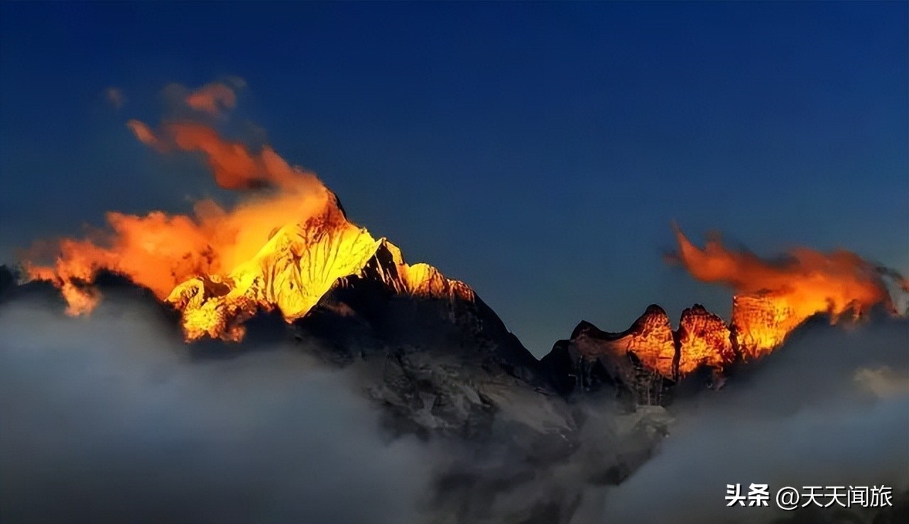 当朝晖晚霞时分,日照群峰夕落金山,天风轻抚,云幕轻合,这里是最近距离观看贡嘎雪山的绝佳之地。能直面贡嘎主峰,还能欣赏波澜壮阔的云海、难得一见的佛光,日落金山更是璀璨辉煌。