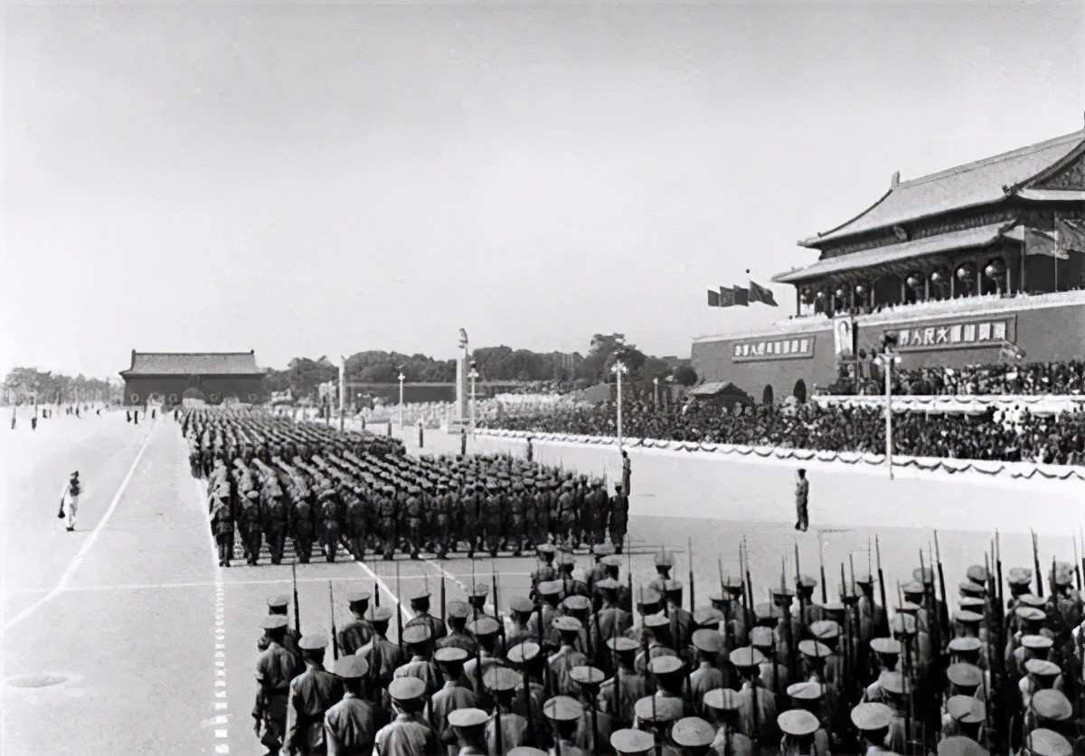 1950年,建国一周年国庆阅兵。阅兵方阵通过天安门前,当时长安左门、长安右门还存在