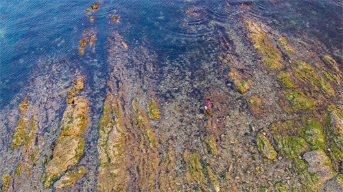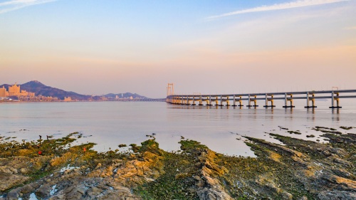大连的海边并不多见天然的沙滩,礁石很多,但是黑石礁还是十分特别的。这里的海岸线曲折多变,约十几亿年前形成的岩溶景观———黑色礁石,遍布于岬湾之中。在傍晚的时候,这里还有很多渔民在作业,应该是捡海带或者一些贝类。从岸边向跨海大桥望去,视觉冲击力极强。