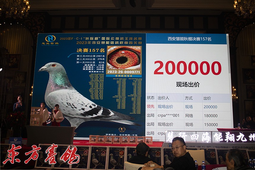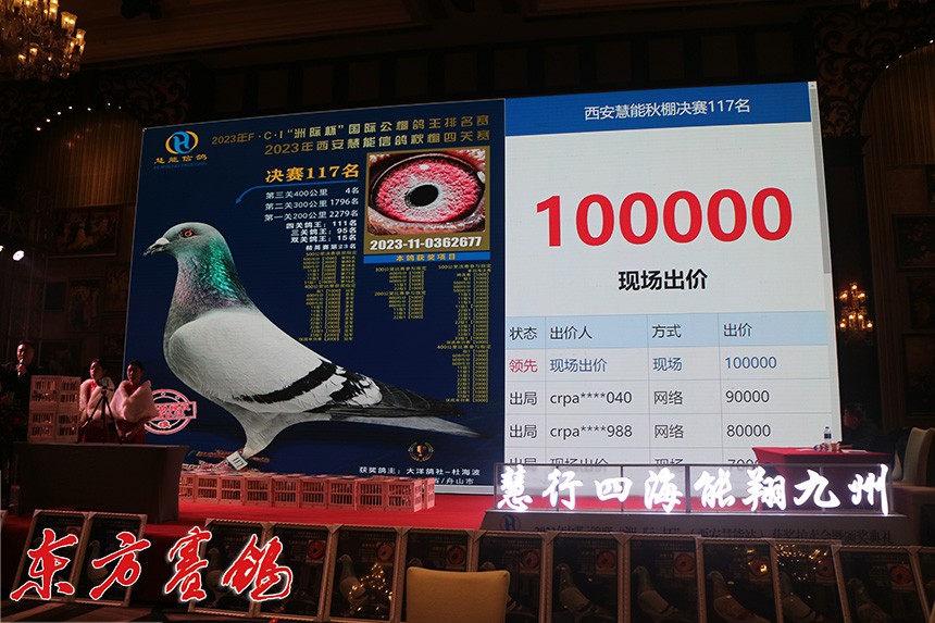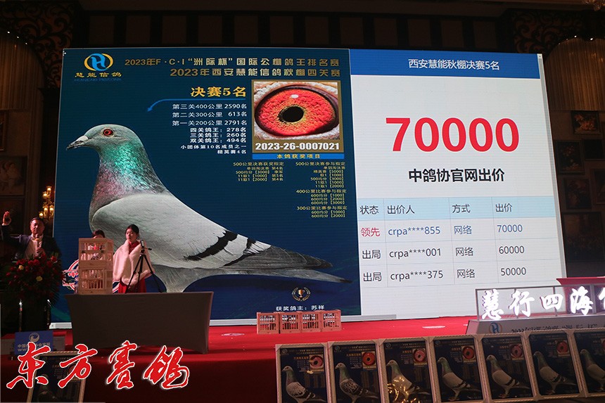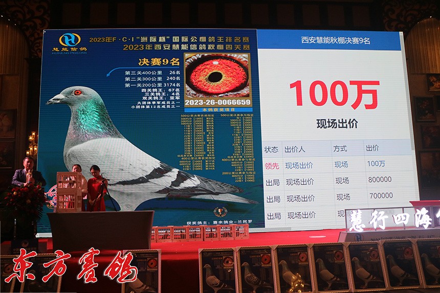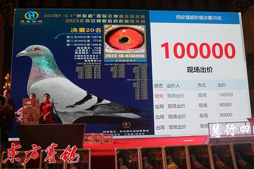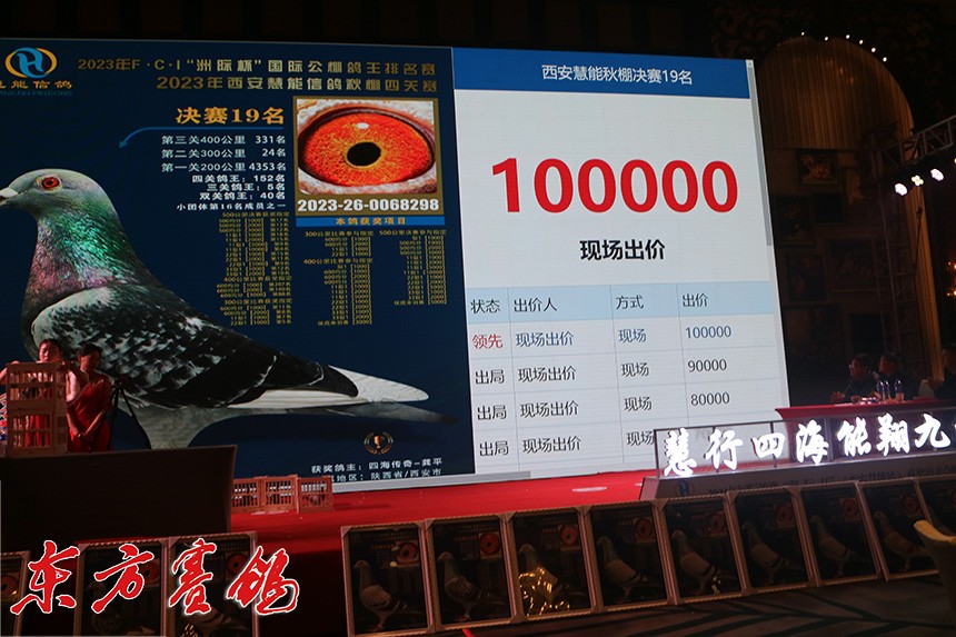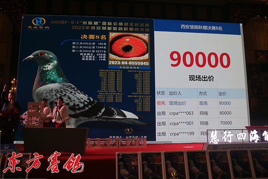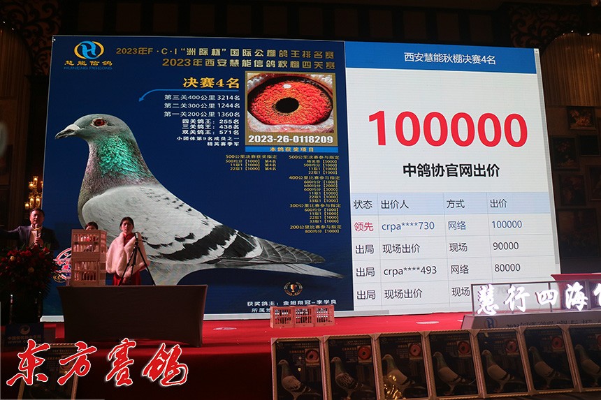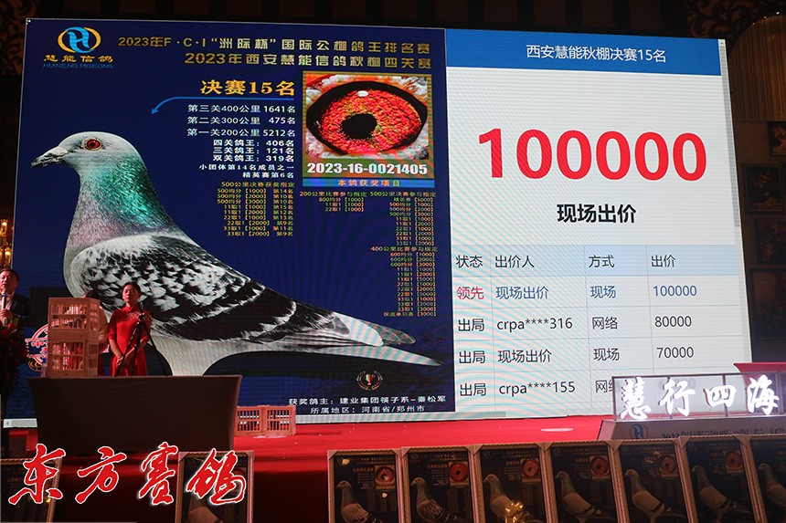 决赛9名鸽主为西安喜余鸽业兰民罗,他以全场最高价拍回收藏。