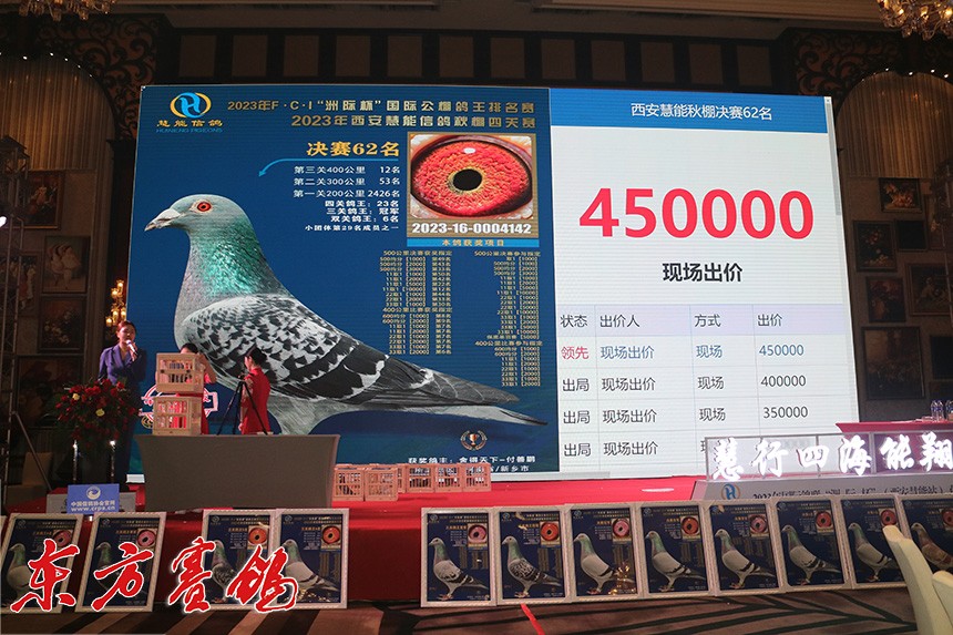 决赛62名鸽主是河南名家付善鹏,他以45万高位拍回自己的战将。