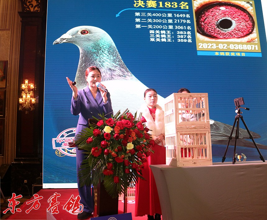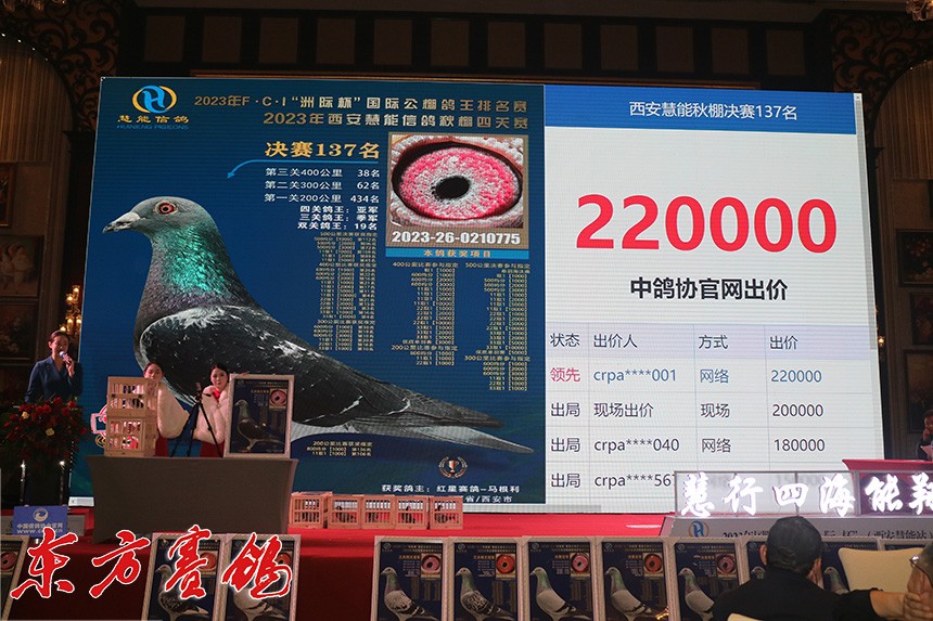 在3—4日二天的拍卖会上,实拍获奖鸽763羽其中决赛冠军——600名,550公里加站赛163名。本次拍卖盛会由全国首席拍卖师李武团队李武、李刚和格格、兰妹妹共同主槌,2日晚上还进行了高规格的颁奖盛典(已另外发文),这场名扬四海的拍卖会,公棚、鸽主和前来选种的鸽友均达到自己理想的效果,763羽鸽子没有一羽流拍,均被网络和现场鸽友拍走。冠军、亚军、季军、24名均以50万高价结拍,决赛9名,鸽主为西安名家喜余鸽业兰民罗,他以全场最高价100万元接回自己的发财鸽。决赛前十羽拍卖总数为315万,从数据上看,鸽友很理性、价格不豪华,但均价在31.5万一羽,价格不菲呀,也为鸽子获得等价齐身价值。