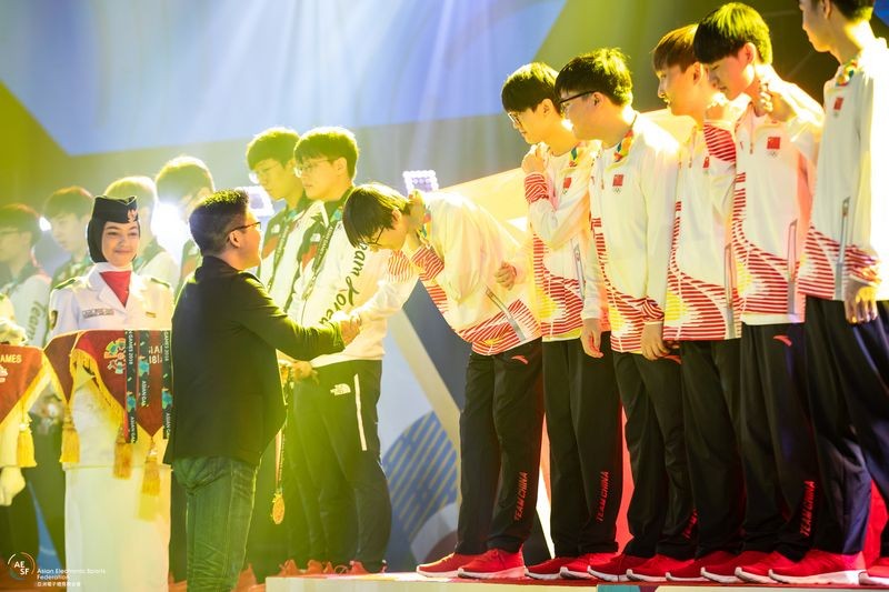 2018年8月29日,刘世宇在雅加达亚运会《英雄联盟》表演项目颁奖仪式上。中国队在决赛中3:1击败韩国队获得金牌。(刘一村摄)