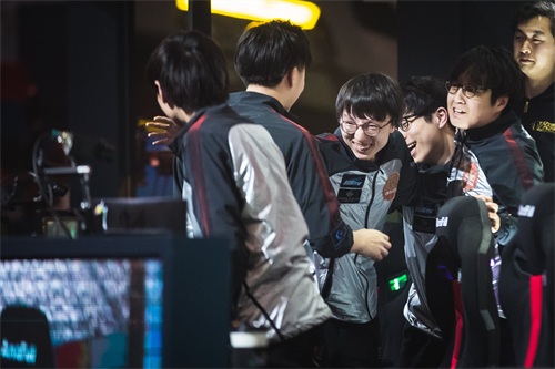 2016年4月25日,刘世宇在3:1力克EDG战队赢得春季赛冠军后与队友庆祝。(刘一村摄)