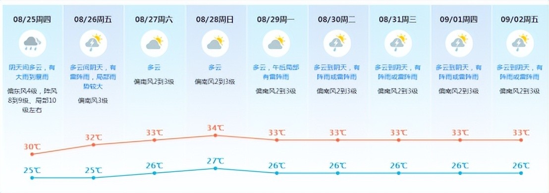 预计我市24日夜间到25日受台风“马鞍”环流影响,有大雨到暴雨,阵风8-9级,沿海及高地10级左右;26日降雨减弱,雷阵雨为主;27-29日以多云为主,局部有雷阵雨,天气炎热;展望8月30日-9月2日有阵雨或雷阵雨。天气炎热,请注意防暑防晒;受台风“马鞍”影响,我市24日夜间到25日有强风雨过程,请注意防御强降水、雷电、大风及其引发的次生灾害。