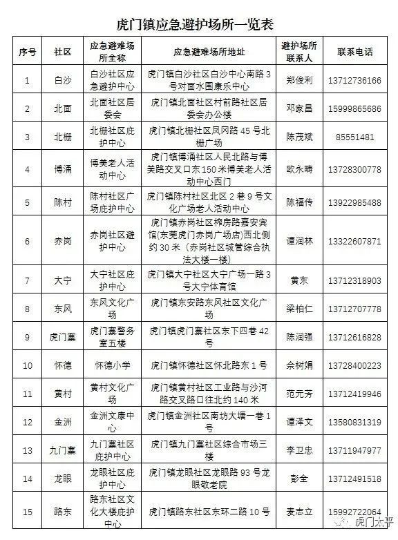 为切实保障人民群众生命财产安全,及时为危险区域群众提供应急避护,虎门镇减灾委员会决定启用镇内28个应急避护场所,为有需要的困难群众提供24小时应急避护。虎门镇呼吁广大群众积极协助、支持救助,共同帮助有需要的人员到就近的救助点接受救助。
