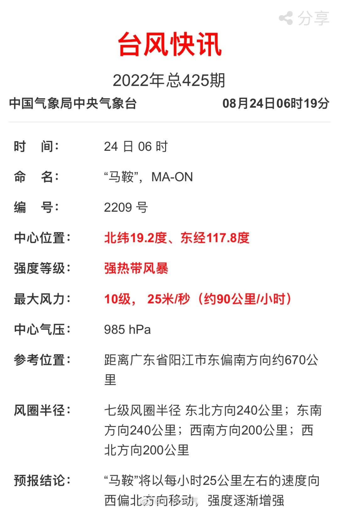 据气象部门预报:24日15时,台风“马鞍”(强热带风暴级)其中心位于距离东莞东南方向约460公里的南海海面上,将于25日凌晨到中午以台风级在我省珠海到湛江沿海地区登陆(较大可能在台山到电白)。