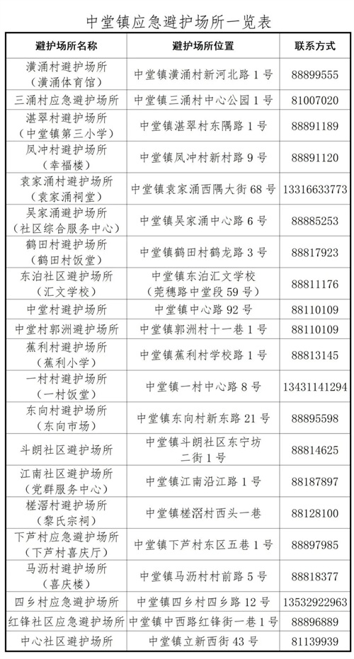 中堂镇三防办已组织相关部门进行会商研判,制定了详细的防御措施,并开放应急避护场所,相关村(社区)有需要的群众可拨打以上联系电话。