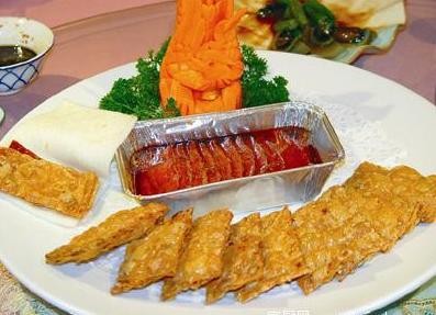 特点:火腿肉嫩,甜咸结合,配以炸酥的豆腐皮和面皮食用,口感酥香。