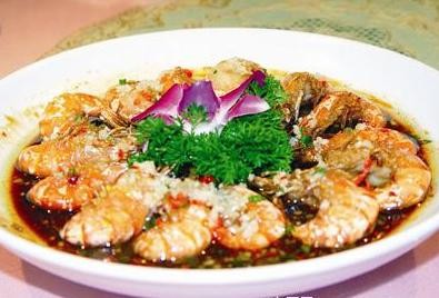 原料:草虾500克,兰花1朵,香芹5克。调料: 色拉油1000克,蔬菜汁(西芹、胡萝卜各100克,洋葱、黄瓜、香菜、姜、大蒜各50克,干陈皮、老抽各10克,冰糖、生抽各100克,十三香5克,海 鲜酱50克,水1000克放入锅中大火熬煮40分钟后过滤,放入美极鲜酱油50克、鸽精30克、味精15克、鱼露30克、蜂蜜20克调味即可)50克,葱 花5克,蒜泥20克,红椒米5克,三味油50克。制作:1、草虾剪去胡须,从腹部沿头、尾深划一刀至虾皮破 开;锅内放入色拉油,烧至八成热时放入处理好的草虾大火浸炸1分钟,待油温升到九成时将草虾再放入色拉油中大火浸炸20秒,取出控油,摆入盘中。2、锅内 放入蔬菜汁大火烧开后出锅浇在草虾上,撒上葱花、蒜泥、红椒米;锅内放入三味油,烧至九成热时出锅浇在草虾上,用兰花、香芹点缀即可。特点:虾肉细腻,口味咸甜有辣。师傅点拨:三味油的制作:将花椒油20克、香油50克、香辣油20克混合后烧至七成热调匀即可。创意:草虾腹部的外皮剖开后一经油炸,自然膨胀得像元宝状,使菜肴美观、立体;同时,用大量蔬菜熬制的调味料也起到增香解腻的作用。