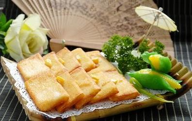 制作 1、先把玉米粉、粟粉、吉士粉、奶粉、白糖、三花淡奶、椰浆纳入盆内加水和匀再加入黄油和成面浆待用。 2、将和好的面浆倒入托盘入蒸笼蒸制30分钟。 3、将玉米块稍微冷冻后切成骨牌片,用威化纸包好,沾上蛋液裹面包糠,入油锅中炸至金黄即可。