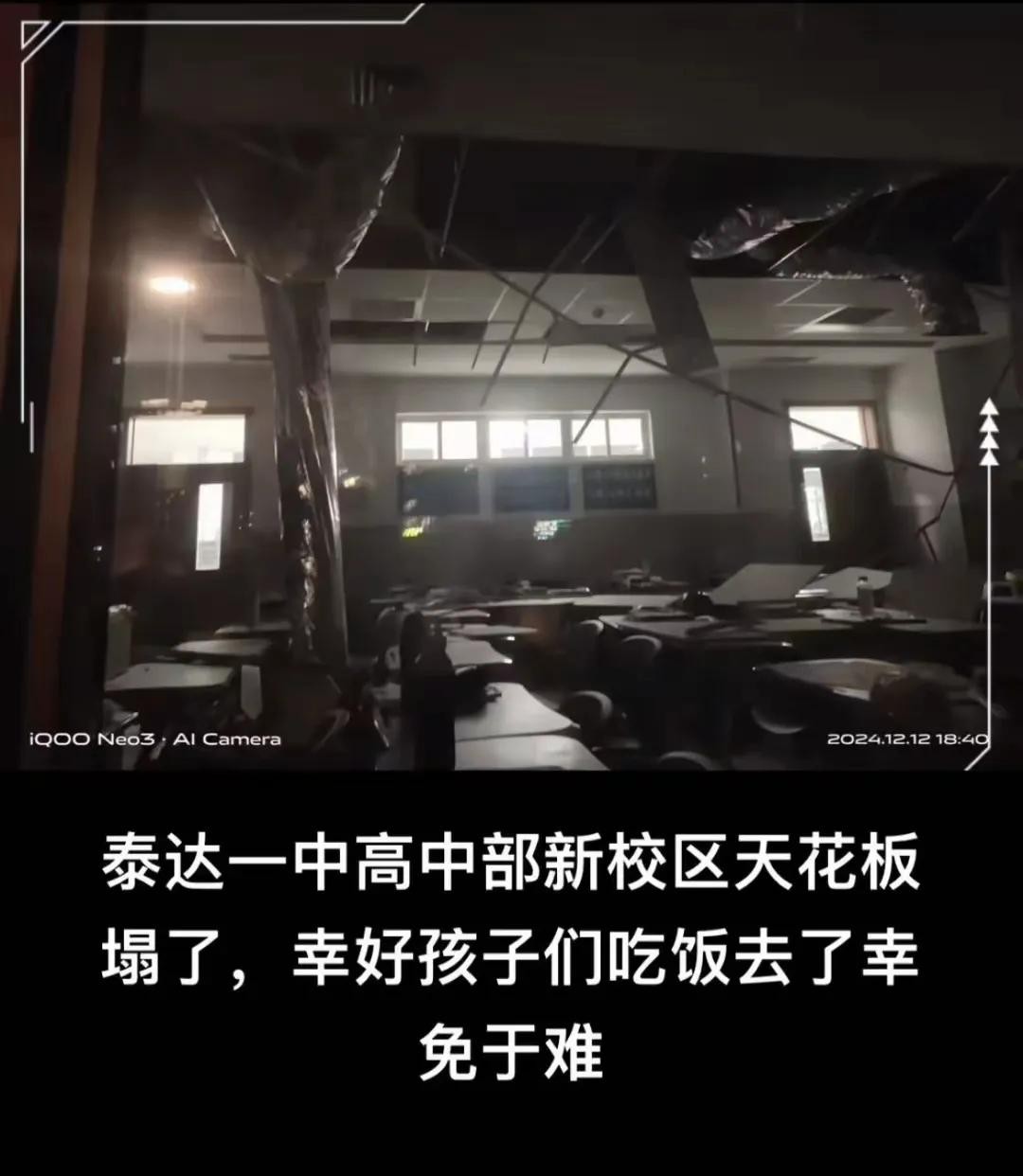 12月12日,天津滨海新区泰达一中高中部新校区教室天花板毫无征兆地坍塌了!有人拍下那一刻的狼藉,坠落的天花板碎块散落一地,破败的现场触目惊心。然而,比现场更让人不安的是:教室里本应回荡着朗朗书声的地方,竟成了一场险些埋葬学生安全的“坟场”。 侥幸的是,那时学生正在用餐,没有造成伤亡。但这份“幸运”背后,谁能保证下一次这样的“坍塌”还会如此温柔?