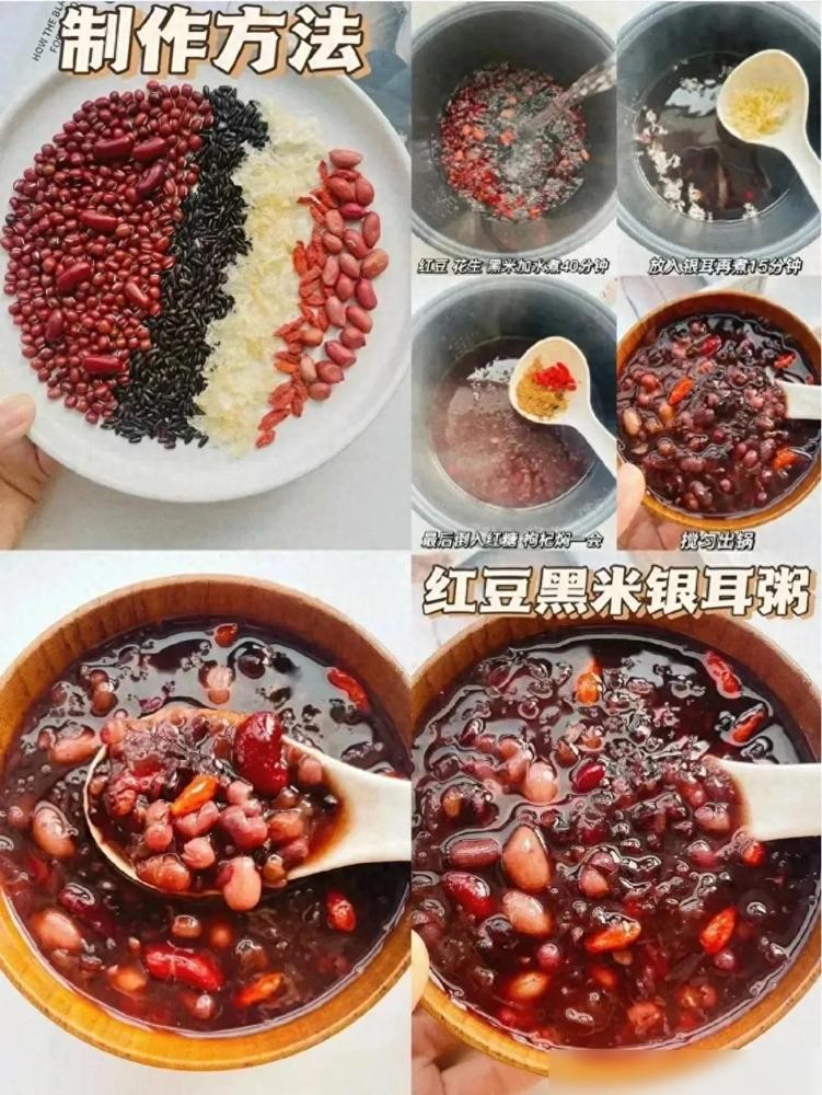 黑米一般在加工的时候就会变成紫色的米,所以煮出来的粥颜色也是紫色,同时里面还会有小红豆,所以这道粥就呈现出紫红色。